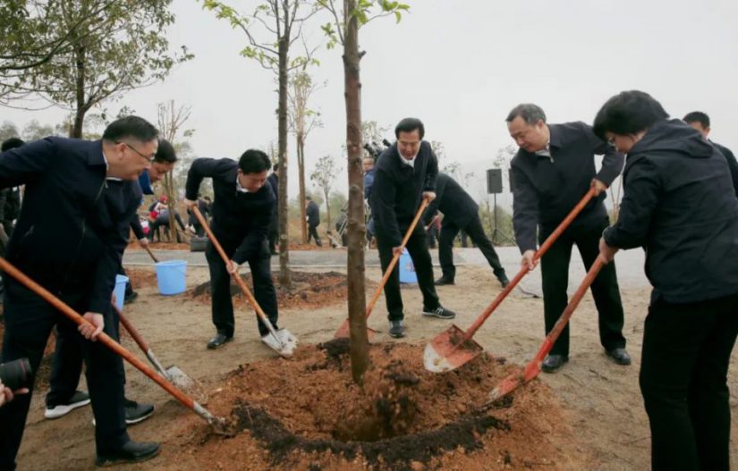 在曲江区北江源头回龙山上的植树点,省人大常委会主任黄楚平与韶关市领导、各级人大代表等一道,种下乐昌含笑、枫香、樟树等一批乡土阔叶树种。(韶关市人大常委会供图)