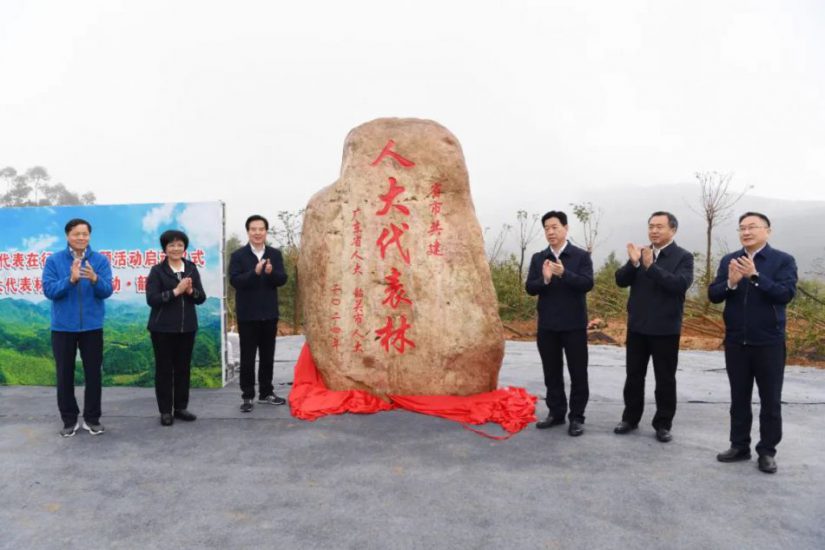 3月14日,2024年“绿美广东·人大代表在行动”主题活动启动仪式暨“省市共建人大代表林”植树活动在韶关举行,省人大常委会主任黄楚平与韶关市领导等一起为“省市共建人大代表林”纪念设施揭幕。刘宇韬 摄