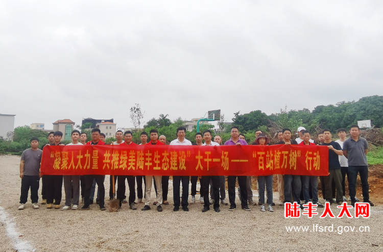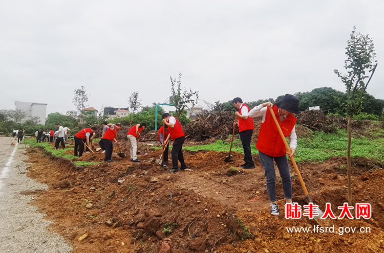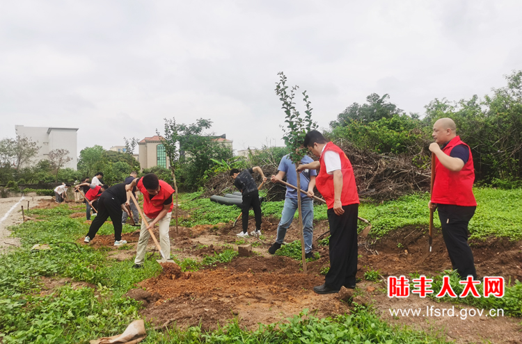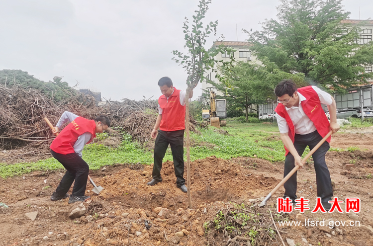 植树现场,大家热情高涨,凝心聚力,密切配合,搬树、扶正、培土、浇水……栽下一棵棵直径5-6公分的小叶紫薇树,为绿美陆丰再添新绿,进一步营造爱绿、植绿、护绿的良好氛围。