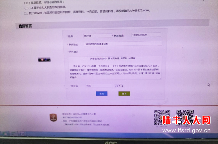 (人大代表陈浮清在陆丰人大网建议征集服务平台提出《关于宣传发动村(居)民种植“乡邻树”的建议》)