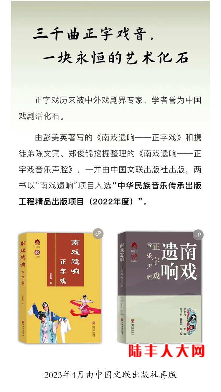 由国家级非物质文化遗产正字戏代表性传承人彭美英著写、出版的《正字戏》(2009年版)(2015年版)及《南戏遗响—正字戏》(2021年版)、《正字戏脸谱》(第一编者)、《南戏遗响—正字戏音乐声腔》(主编)等5本图书,是正字戏集舞台实践、艺术创研、传承发展于一体的艺术丛书和正字戏代代相传的教科书,为中国戏曲史和宋元南戏研究提供了翔实有力的重要依据,作出了重大贡献;2021年版的《南戏遗响——正字戏》及携其徒弟陈文宾、郑俊锦挖掘整理出版的《南戏遗响—正字戏音乐声腔》以“南戏遗响”项目入选“中华民族音乐传承出版工程精品出版项目(2022年度)”,于2023年4月由中国文联出版社再版。 其本人入选文化部“中华优秀传统艺术传承发展计划”2016年度戏曲专项扶持项目“名家传戏——当代戏曲名家收徒传艺”工程,传承、导演正字戏优秀传统剧目《刺梁骥》《百花赠剑》,是当时全省入选的四个剧种之一(粤剧关国华、潮剧姚璇秋、汉剧梁素珍、正字戏彭美英);2023年被评为“首届汕尾市文艺奖终身成就奖”。