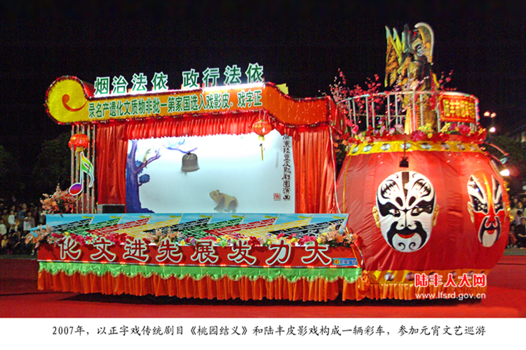 2007年创新以一辆双面舞台能同时展演不同皮影戏剧目的彩车参加了陆丰市元宵文艺巡游,实现皮影戏户外巡游、移动演出“零”的突破;