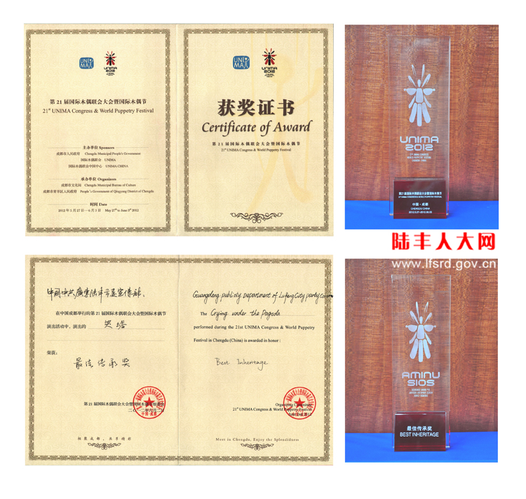 2012年5月27日至6月3日,陆丰皮影戏应邀参加在四川成都举行的“第21届国际木联大会暨国际木偶艺术节”,凭借《哭塔》一剧荣获“最佳传承奖”,这是陆丰乃至汕尾地区文化艺术领域首次获得的国际性奖项;