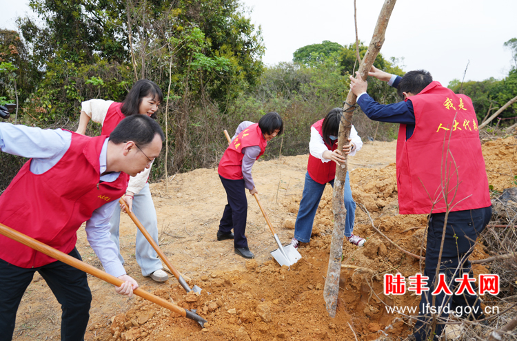 据悉,为更好发挥人大代表作用,抢抓开春种树“黄金期”,3月11日,陆丰市人大常委会将助推绿美陆丰生态建设与“百千万工程”结合起来,连续第三年向代表吹响向“绿”履职“号角”,向人大代表发出《助力绿美陆丰生态建设,人大代表持续行动——致全市各级人大代表倡议书》;陆丰市2238名四级人大代表纷纷响应号召,连续第三年带头“认种、认养、认捐”,全面掀起造林绿化热潮,形成代表带头、企业助力、社会支持、群众参与的全民“爱绿、植绿、护绿、兴绿”的良好氛围。