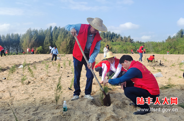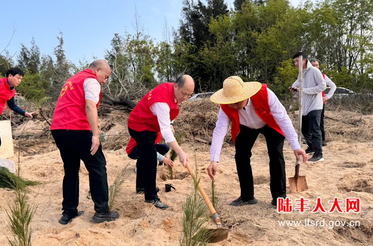 活动现场党旗招展,代表们身着人大红马甲,三人成组、五人成团,或挥锹铲土、或扶苗培土、或围堰浇水,呈现出一派热火朝天的劳动景象。“铁锹挥舞如笔,汗水挥洒似墨”,经过几个小时的努力,一棵棵树苗在山坡间昂然挺立,在春风中舒展新枝,为原本裸露的山坡披上了绿装。此次植树活动,人大代表会同镇全体干部职工、村(社区)两委干部、网格联防员、相关共建单位、师生代表、志愿者等约200人,共种植了1万株木麻黄,种植面积约20亩,以实际行动为绿美陆丰生态建设增绿添彩。