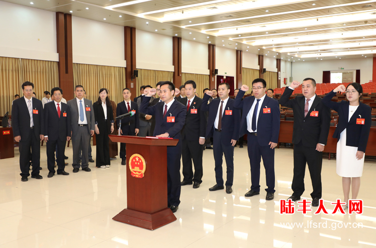 新当选的陆丰市人民政府市长郭立坚,陆丰市人大常委会副主任傅锦冲、林坤国,陆丰市人民法院院长高炯峰,陆丰市第十六届人民代表大会常务委员会委员沈舒熳、陈建钢、周伟标向宪法宣誓。