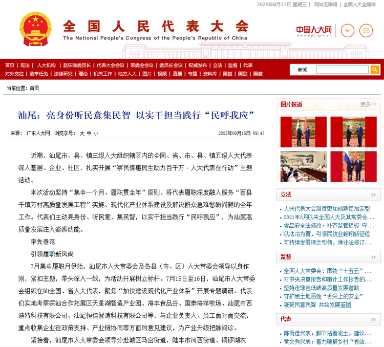 《中国人大网》2025年8月15日转发了《汕尾:亮身份听民意集民智 以实干担当践行“民呼我应”》,现转发。